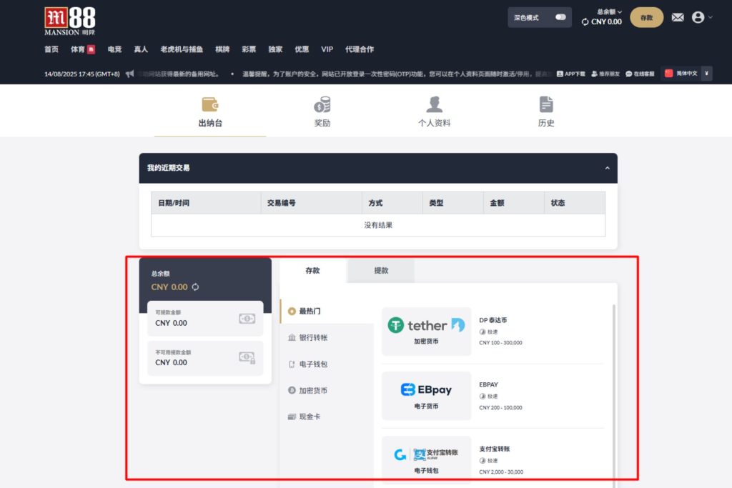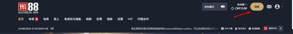 首先,访问 M88明陞官网并使用您的用户名和密码登录账户。登录后,在首页点击“存款”按钮。